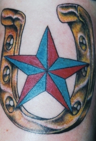 腿部彩色金色马蹄铁和五角星纹身