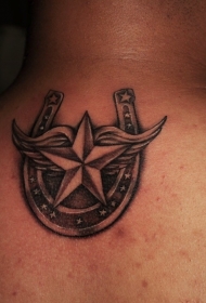 背部棕色马蹄铁与翅膀纹身图片