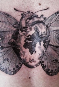 胸部个性心脏和蝴蝶翅膀组合纹身图案