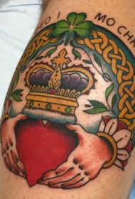 小腿圆形凯尔特结与皇冠心形纹身图案