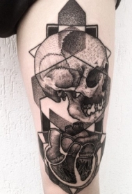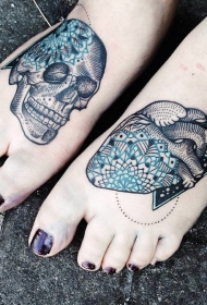 脚部雕刻风格的彩色人类头骨和心脏纹身