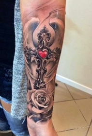 小臂逼真的翅膀红心和玫瑰十字架纹身图案