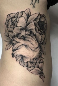 侧肋心脏与花卉线条点刺纹身图案