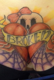 破碎的心形与玫瑰和蜘蛛网胸部纹身图案
