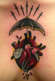 胸部心脏雨伞和匕首纹身图案