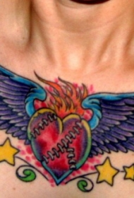 胸部心形和五角星翅膀纹身图案