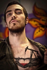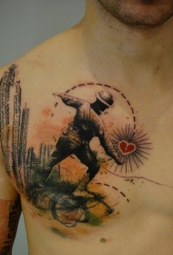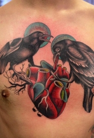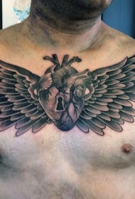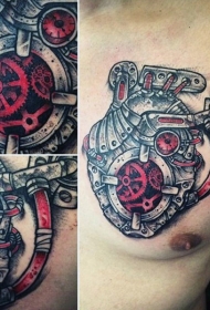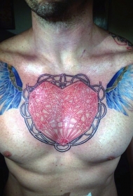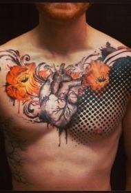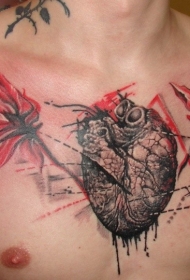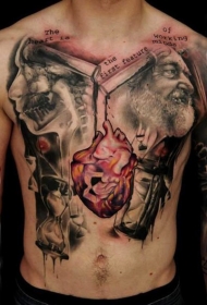 胸部黑灰人物肖像和红色的写实心脏纹身图案