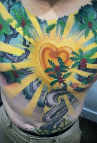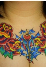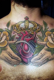 old school胸部彩色心脏与手花朵皇冠纹身图案