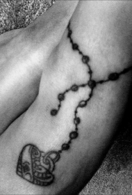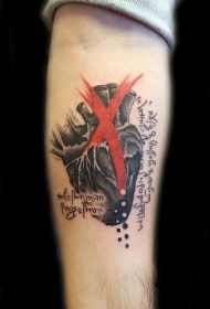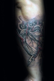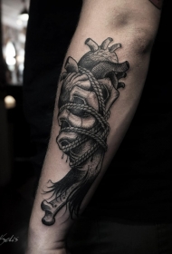 雕刻风格黑色心脏与骨头和绳子手臂纹身图案