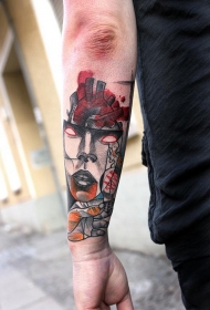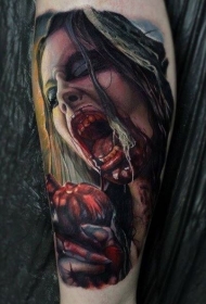 彩色恐怖风格血腥女人与心脏手臂纹身图案