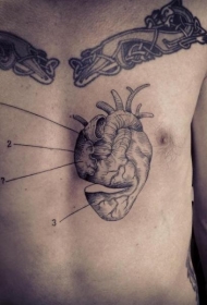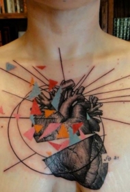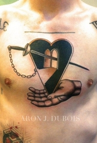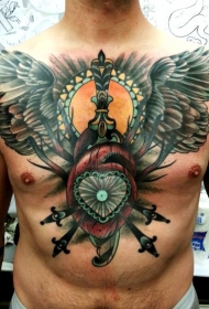 胸部和腹部彩色心脏与翅膀和匕首纹身图案