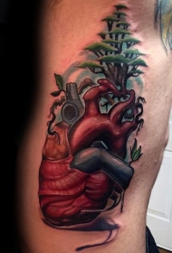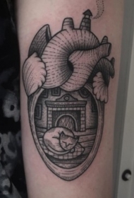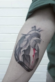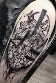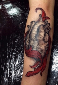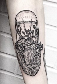 雕刻风格黑色心脏与树枝手臂纹身图案