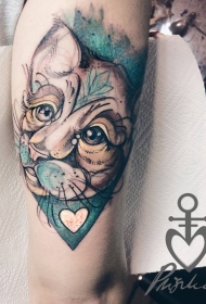 素描风格彩色美丽的猫与心形手臂纹身图案