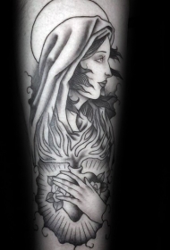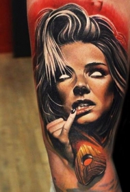 彩色恐怖风格女性肖像和心形手臂纹身图案