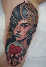 复古风格的彩色部落女性肖像和心形手臂纹身图案