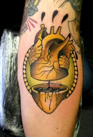 手臂雕刻风格的彩色心脏与火焰纹身图案