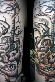 神秘设计的彩色树形吉他与心脏手臂纹身图案