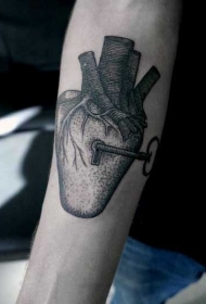 手臂黑色点刺的心脏锁与钥匙纹身图案
