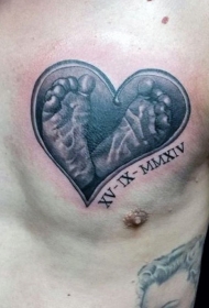 胸部可爱的纪念风格黑色心形与婴儿脚印纹身图案