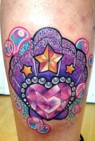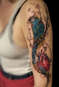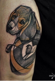 大臂雕刻风格彩色狗与心形小鸟纹身图案