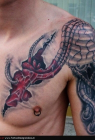 肩部美丽的彩色心形锁与玫瑰纹身图案