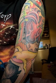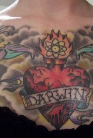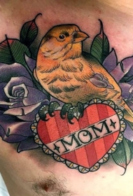 new school胸部彩色小鸟与玫瑰和心形纹身图案