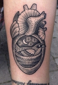 胸部雕刻风格黑色心脏与翅膀纹身图案