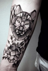 小臂雕刻风格黑色狼头与心脏几何纹身图案