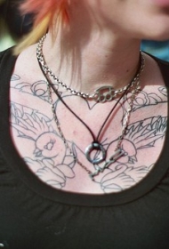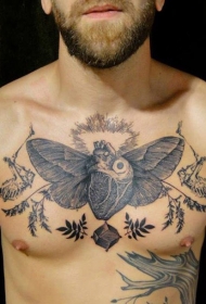胸部黑墨色的蝴蝶翅膀与心脏纹身图案