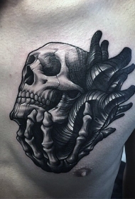 胸部雕刻风格黑色心脏与骷髅纹身图案