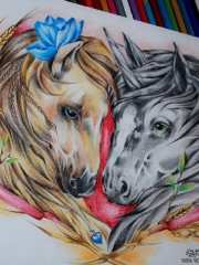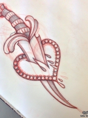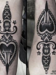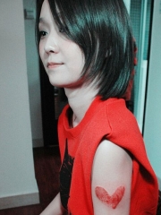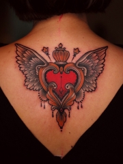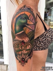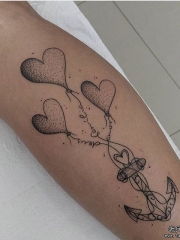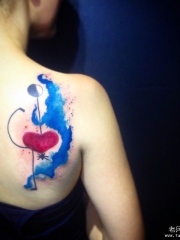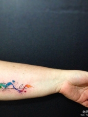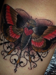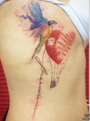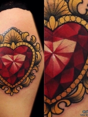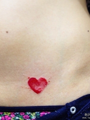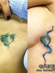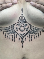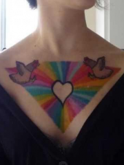 女性胸部彩虹色几何与心形小鸡纹身图案