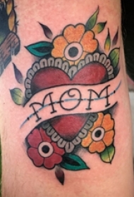 男生手臂上彩绘简单线条心形花朵和英文纹身图片