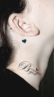 美女颈部心形花体英文纹身