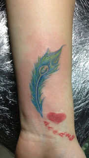 手腕羽毛心形纹身