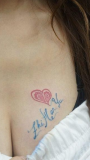 女性胸部英文字和心形纹身图案