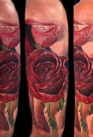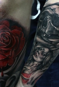 现实主义风格的彩色红色玫瑰与鬼嘴纹身图案