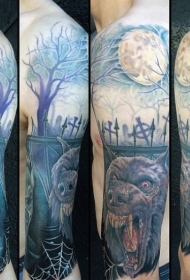 新的学校风格公墓与狼人肩部彩色纹身图案
