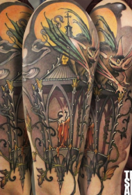 颈部卡通彩绘吸血鬼蝙蝠和旧钟楼纹身图案