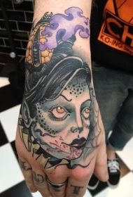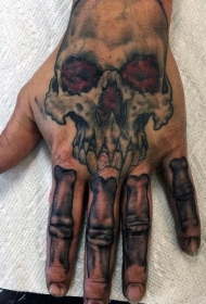 手背彩色有趣的吸血鬼骷髅与骨头纹身图案