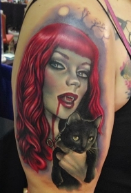 手臂传统风格彩色吸血鬼女人与猫纹身图案