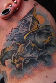 彩色肩部旧蜡烛街打火机与吸血蝙蝠纹身图案