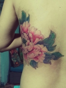 腰部上方的艳丽牡丹花纹身刺青