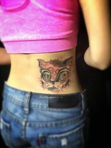 女生腰部上的小花猫纹身图案