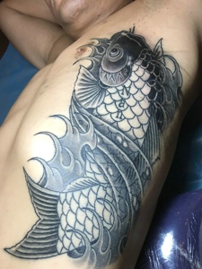 男士腰部上的黑白鲤鱼纹身图案