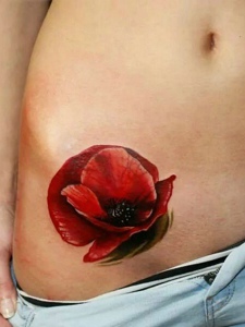 腰部上盛开鲜艳的大红花朵纹身刺青