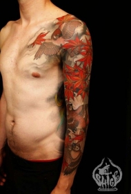 手臂亚洲风格逼真的鸟与枫叶纹身图案