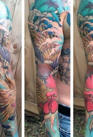 花臂亚洲风格设计的五彩大公鸡纹身图案