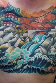 胸部亚洲风格的彩色房子与瀑布纹身图案