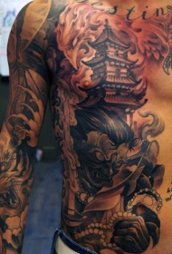 腹部亚洲风格巨大的房子和恶魔字母纹身图案