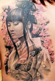 背部写实的彩色亚洲艺妓肖像纹身图案